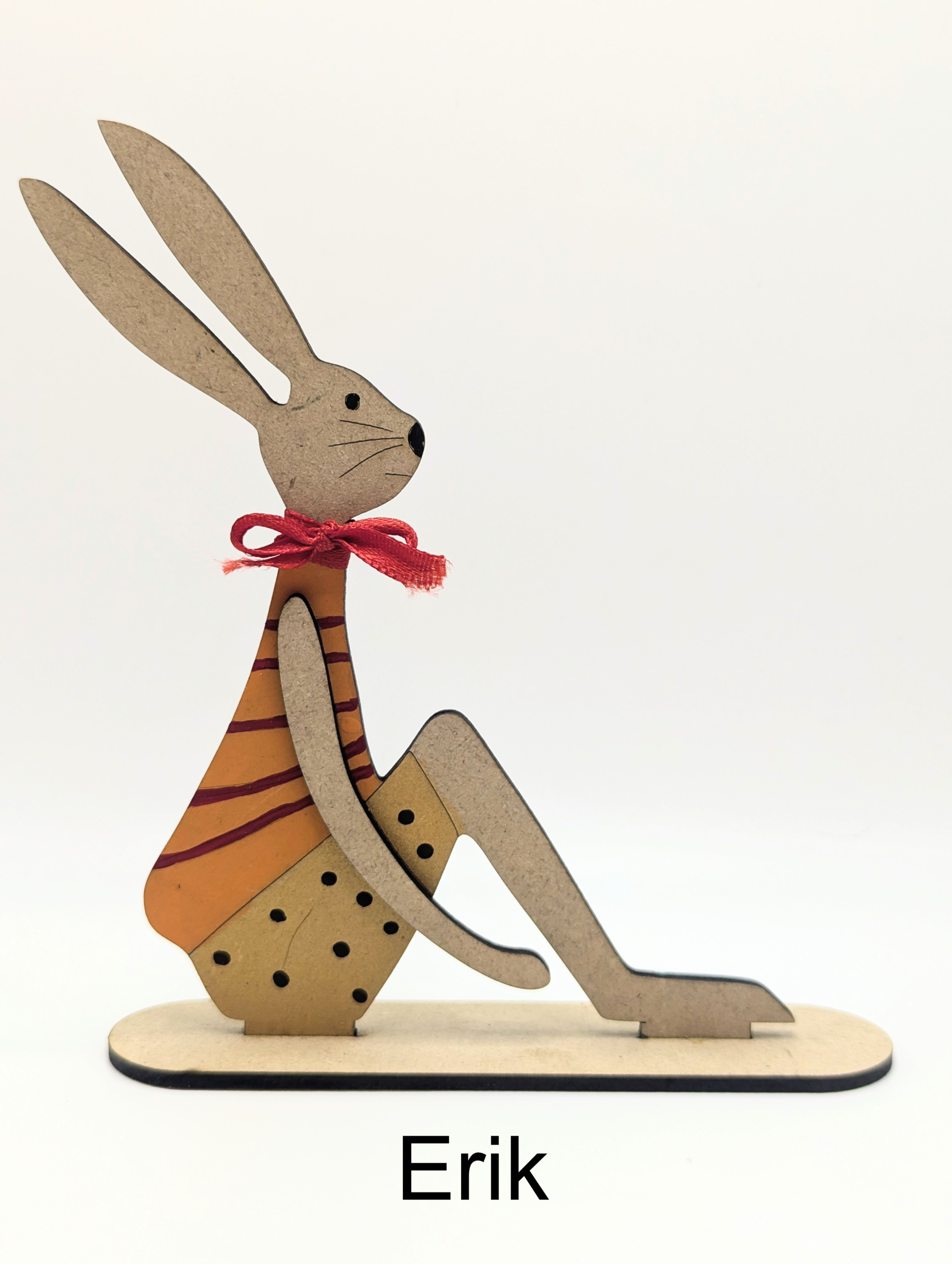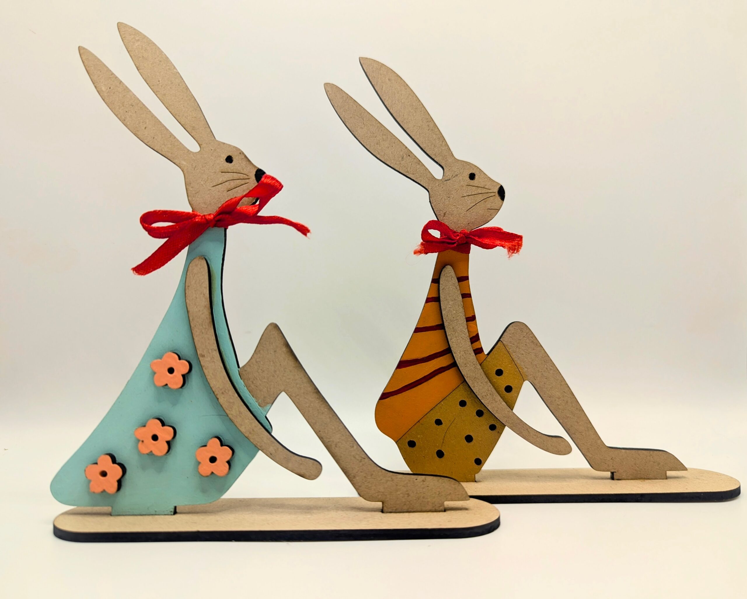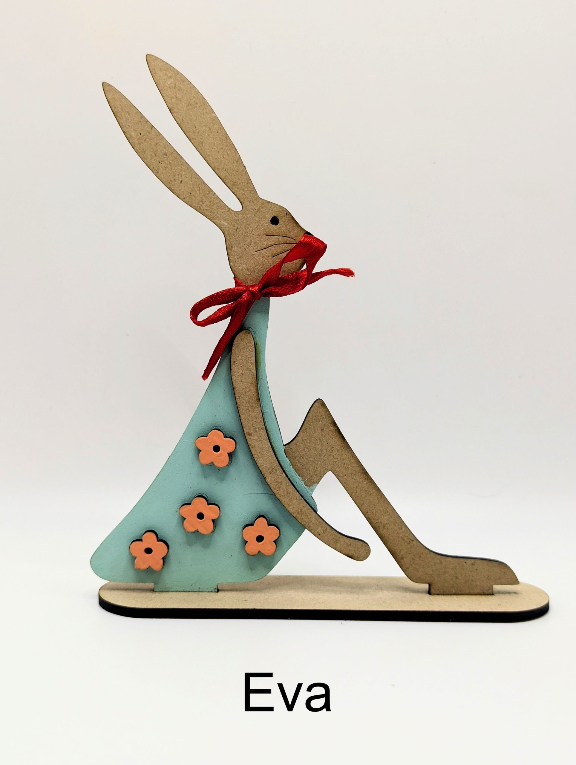 Cada pieza es cortada con precisión en MDF de 3 mm y decorada cuidadosamente a mano, combinando tonos suaves y detalles delicados como flores, patrones y un moño que aporta un toque alegre y tradicional.