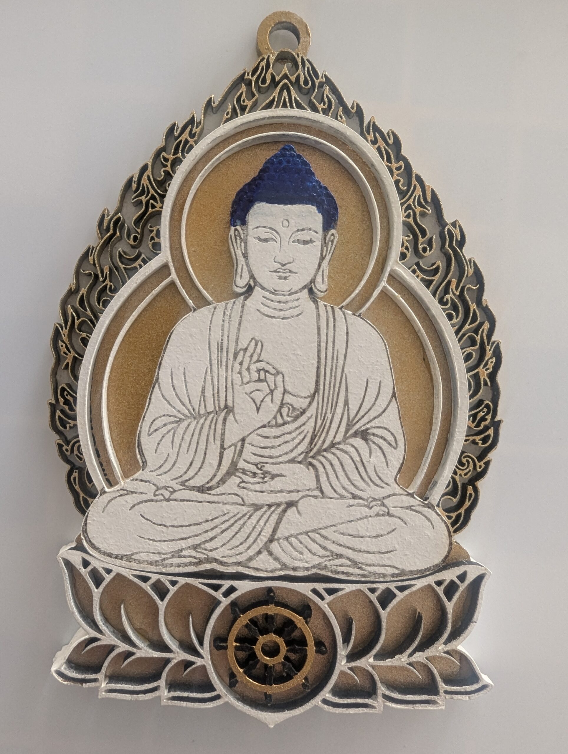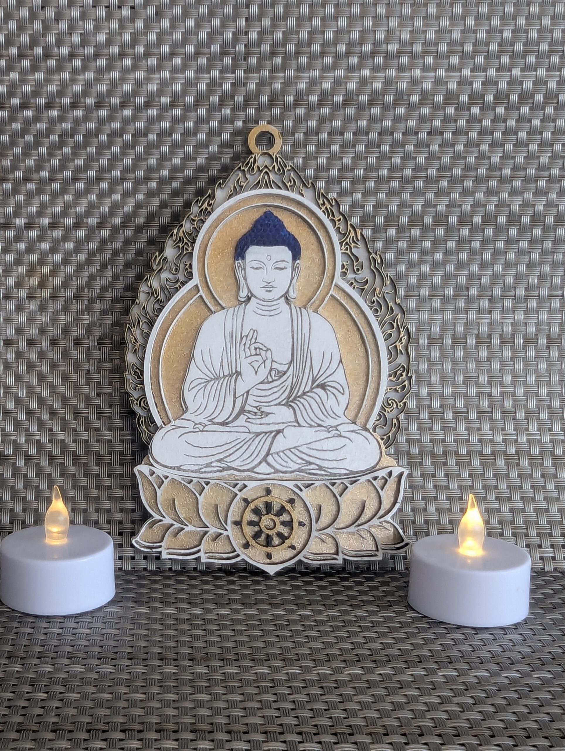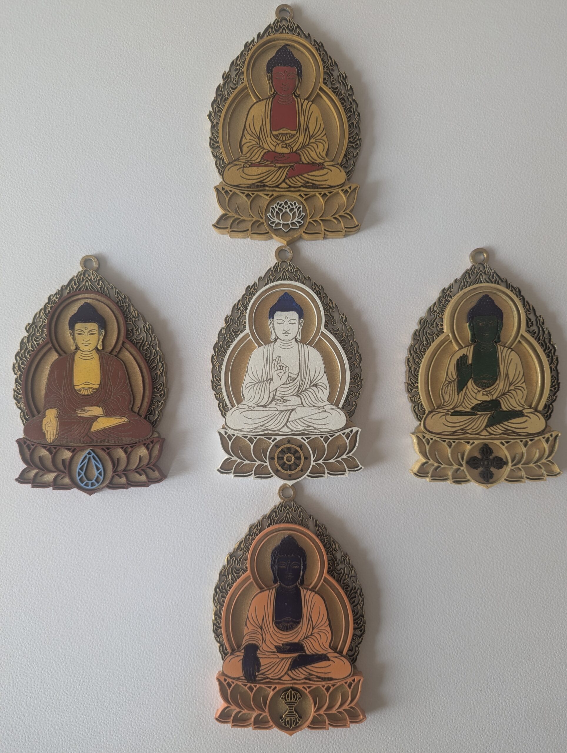 Representado con su cuerpo de color blanco o tonos claros, Vairocana simboliza la sabiduría primordial, la claridad mental y la conciencia plena. Es el centro de los Cinco Budas, y su energía nos recuerda la conexión entre todas las cosas.